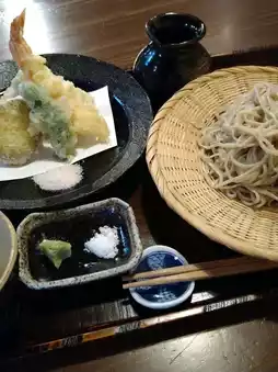 The soba noodles made with Kibune spring water are easy to swallow, and the seasonal vegetable tempura is crispy!