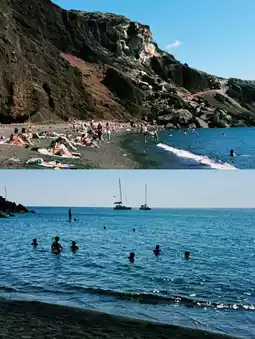 After enjoying Oia, the journey continued to Red Beach, which welcomed visitors with a completely different charm. The striking contrast of the red cliffs, black sand, and crystal-clear waters vividly showcases the grandeur of nature. Sitting beneath the cliffs listening to the sound of the waves, or walking along the beach capturing photos, creates unforgettable memories of the trip.