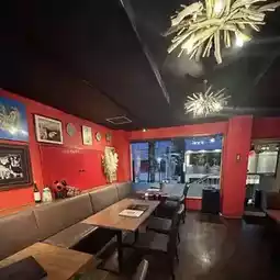 The interior, with its red-themed decor, is lovely.