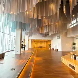 Classical music plays in the background of the building, and the grand piano sits majestically against the backdrop of the sea, making it look like a wedding hall✨