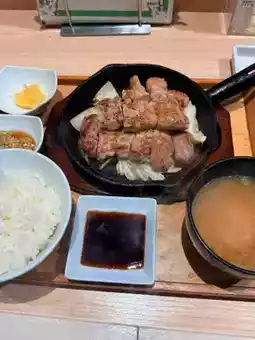 The sizzling hot iron plate carries freshly seared pork cutlets. To prevent overcooking and maintain the perfect texture, cabbage leaves are placed underneath. Unlike the typical steak-eating experience with a knife and fork, this restaurant offers a Japanese-style fusion pork cutlet set meal. It includes Okayama-grown rice, Hokkaido kelp broth, and miso from a long-established Okayama shop, creating a dish that is both locally inspired and modern.