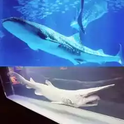Okinawa's famous aquarium is vast and home to a wide variety of marine life. Outdoors, you can feed sea turtles and see various marine creatures through large floor-to-ceiling windows, including the famous whale sharks. The whale sharks are truly enormous, filling the entire aquarium. The classic dolphin show and feeding shows are spectacular. Visitors come to see whale sharks, sharks, manta rays, many tropical fish, jellyfish, and more. It's an amazing place worth visiting.