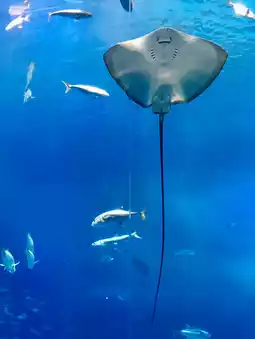 The large aquarium where a wide variety of fish, including whale sharks and manta rays, swim is impressive