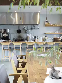 Awayk has a stylish interior with wood and concrete. The interior is stylish, and you can see the ocean from the large windows.