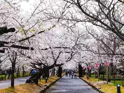 Omura Park is located in the moat outside the old Kushima Castle. Locals often sit under the cherry trees to enjoy the flowers, have picnics, and enjoy the romantic cherry blossom atmosphere.