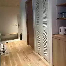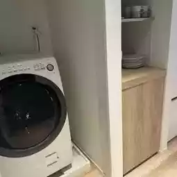 On the left side of the corridor, there is a toilet, a drum washing machine, and a kitchen โจ