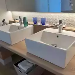 The double bowl wash space and the bathroom with a bathtub are also nice ๐