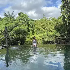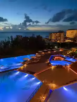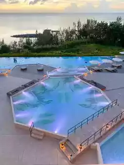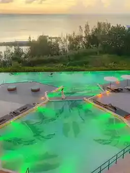 At night, the pool is lit up in blue, creating a romantic atmosphere️🩵