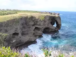 On the cliffs of the coast, there are rocks shaped like elephant trunks