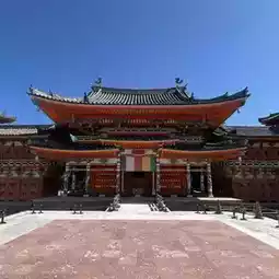 It was built as a homage to the Jodo Buddhist temples of the Nara and Heian periods, incorporating twill patterns and crimson colors.
