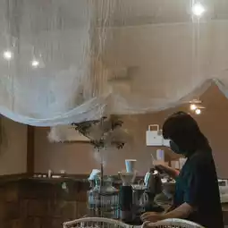 Sit at the counter and you can see the tracks with the yellow train running right in front of you 🚃