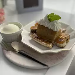 They caramelize the bananas after you order. It also comes with ice cream, and the Baumkuchen is moist. Recommended for banana lovers. Tropical Peach Ade 550 yen