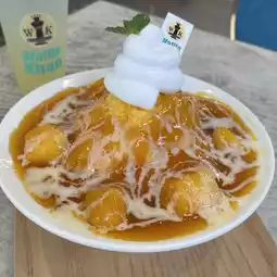Korean shaved ice with a crunchy texture and a gentle mouthfeel. Eat it while mixing it with mango and special sauce.