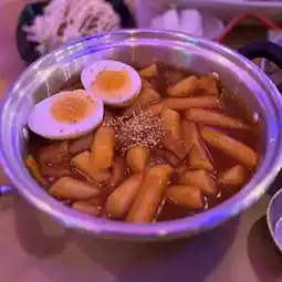 Tteokbokki with a delicious sweet and spicy sauce. It comes with lots of chewy rice cakes (tteok). The spiciness kicks in later, but it's addictive.