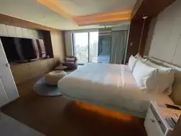 The bedding is also very comfortable, the TV in the bedroom is super large, and there is the same swivel sofa in the living room, but the cloakroom is slightly smaller.