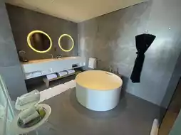 The bathroom space is large, the large round bathtub is perfect for bathing, bath supplies