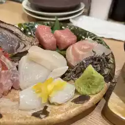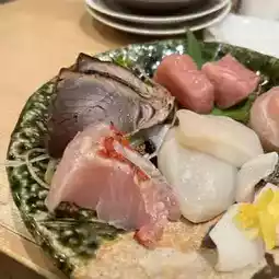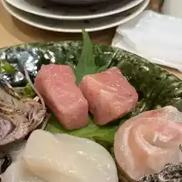 This time, we went as a group of two, so the photo shows two portions. Five kinds of sashimi: bluefin tuna, bonito olive oil, red snapper, seaweed scallops, sake and kelp-cured sea bream, and squid sashimi with yuzu flavor. Everything was delicious and the price felt very reasonable.
