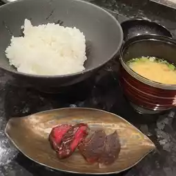 Served with the main dish of tonteki and hamburger steak. The rice is cooked in a clay pot. Shibazuke and Nara pickles are also served on the side.