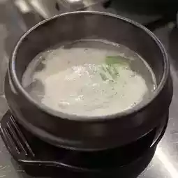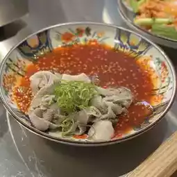 A milky soup with plenty of beef bone flavor. Rich and refreshing. Not spicy at all, it's a great stomach-relief.