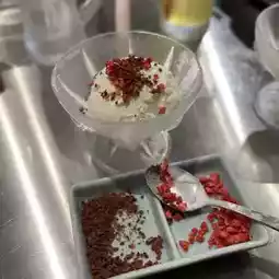 A sweet dessert after a meal. Topped with freeze-dried chocolate and strawberries.