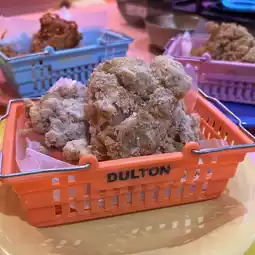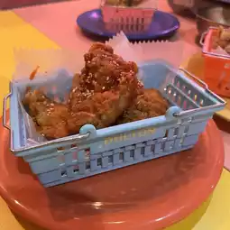 Three types: plain, yangnyeom, and snow. The large, hot, crispy chicken is juicy and the fat will pop out in your mouth.