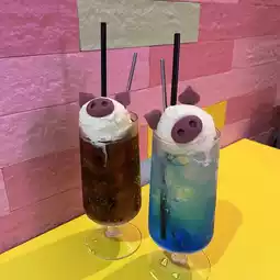 A cute pig-shaped cream soda made with cola and blue Hawaii. It can also be enjoyed as a dessert.