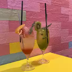 A colorful and refreshing carbonated drink with a fruit flavor. Made with kiwi and pink grapefruit. It also contains fruit pulp.