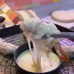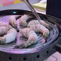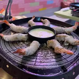 Plump shrimp wrapped in pork belly is grilled on a hot plate and enjoyed with melted cheese. You can also season it with salt sesame oil and samjang and wrap it around vegetables for a healthy taste.