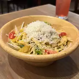 Plenty of crunchy fresh vegetables, and a delicious dressing with a good balance of sweetness and sourness. Topped with cheese grated right in front of you.