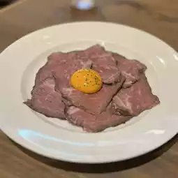 The tenderness and flavor of the red meat, the moderately melted fat of the meat, is topped with a generous amount of egg yolk and sweet sauce.
