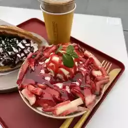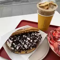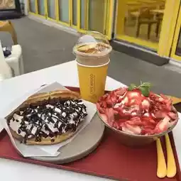 Fresh strawberry shaved ice, Nutella waffle, and a Talgona Latte (caramelized caramel latte).