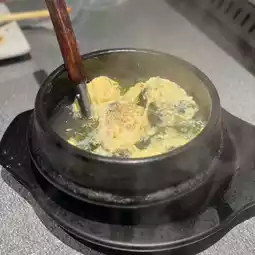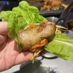 Bone-in beef samgyeopsal made with beef belly. Grilled until crispy on the outside and wrapped in ingredients and lettuce. Juicy samgyeopsal with a slightly sweet fat.