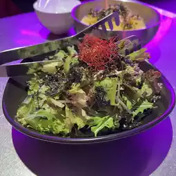 In addition to leafy vegetables, it contains mizuna and other vegetables, giving it a crunchy texture. It is also rich in the flavor of the dressing, the saltiness of the Korean seaweed, and the sesame oil.