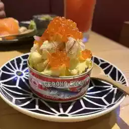 A platter of five kinds of tuna, salmon, sea bream, shrimp, and amberjack. It is sprinkled with flying fish roe and comes in a treasure chest, making it a fun presentation.