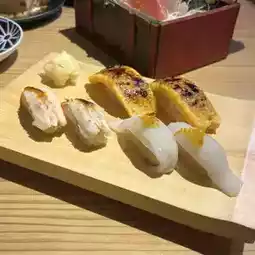 2 pieces of each of the three types of sushi: squid somen with karasumi, seared shrimp with sea urchin sauce, and Okukuji egg brulee sushi.