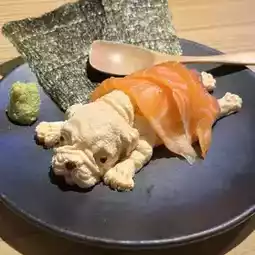 A cream cheese pate in the shape of a realistic dog, wrapped in nori seaweed together with smoked salmon. This is a limited-edition menu that is sure to sell out.