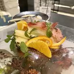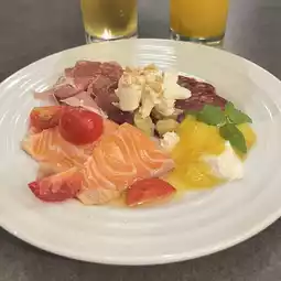 -Assortment of 5 appetizers Salmon cutlet carpaccio Prosciutto, salami, mango and ricotta cheese caprese, etc. Colorful and stylish to look at.