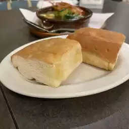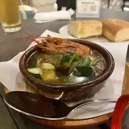 The shrimp and vegetable ajillo is attractive for its oil with dashi stock. You can enjoy the flavors of shrimp, garlic and olive oil. Dip the freshly baked bread in oil.