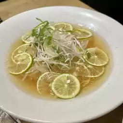 Cold noodles with plenty of sudachi floating on top, refreshing in appearance and taste. The noodles have a nice texture and the soup is tasty but light.