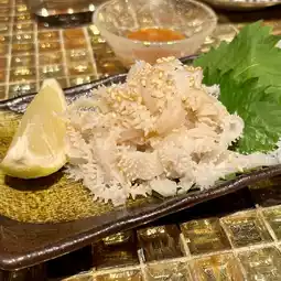 It has a light taste with no unpleasant odor, a firm chew and a rich flavor. It is served with ginger, grated garlic and soy sauce.