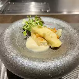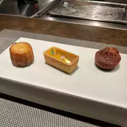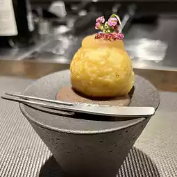 The course starts with a dish that looks like takoyaki. This dish highlights the deliciousness of the foie gras sauce, which can be enjoyed like a dessert.