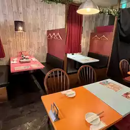 The restaurant has a neon sign and is stylish and pop, with open table seats and semi-private rooms for a more private dining experience.