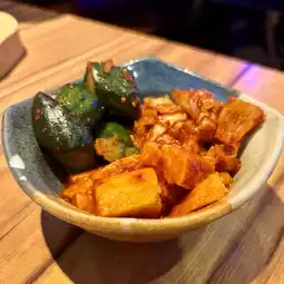 Three types: Chinese cabbage, cucumber, and mountain yam. The balance of the sweetness of the vegetables, the umami and sourness of fermentation, and the spiciness of the chili pepper is excellent.