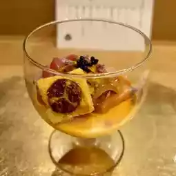 A luxurious dish of gently sweet carrot mousse topped with tuna, salmon, sea urchin, caviar and a sweet tamagoyaki (rolled egg) with the family crest.