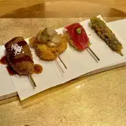 Smelt wrapped in shiso leaves, kelp with roe topped with tuna, daikon radish simmered in Japanese broth with porcini mushrooms and foie gras sauce, and four skewers of beef fillet. There is also a vegetable stick to cleanse the palate.