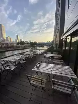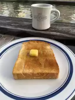 A breakfast set of toast and coffee costs just 385 yen. The cost performance is amazing. This is a stylish cafe in Kitahama, Osaka, where you can see Nakanoshima Rose Garden from the terrace seats along the river.