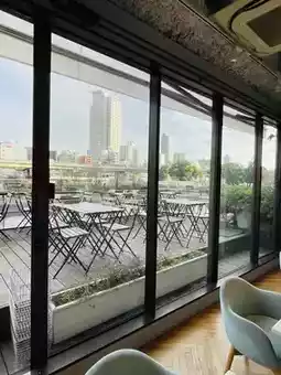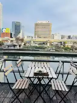 This is a cafe in Kitahama where you can spend time looking out at the Tosabori River.