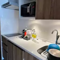 The kitchen is incredibly spacious and equipped with pots, pans, plates, and even a rice cooker!!!!