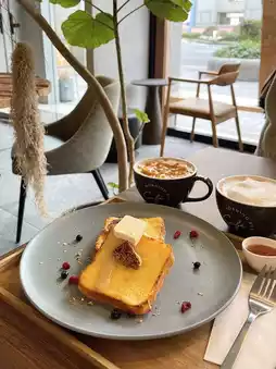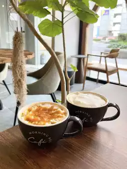 The decoration of Café Morning Box is mainly wood and warm colors, and there are many green plants around it. It makes people feel very relaxed.