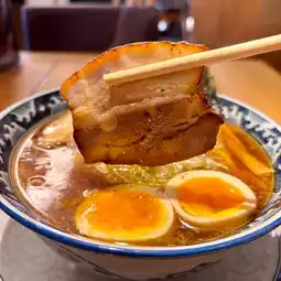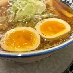The thin, curly noodles have just the right amount of bite and mix well with the soup. Toppings include roast pork, bamboo shoots, white spring onions, and seaweed. Add a boiled egg for an extra 130 yen.